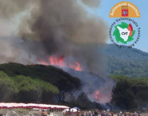 SCARLINO. Fiamme alimentate dal gran caldo al Puntone: sul posto tre elicotteri dell'Antincendio boschivo e dei Vigili del Fuoco. Bagnanti in fuga