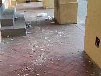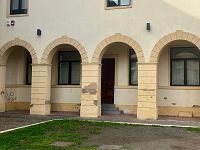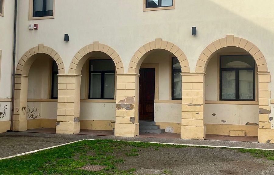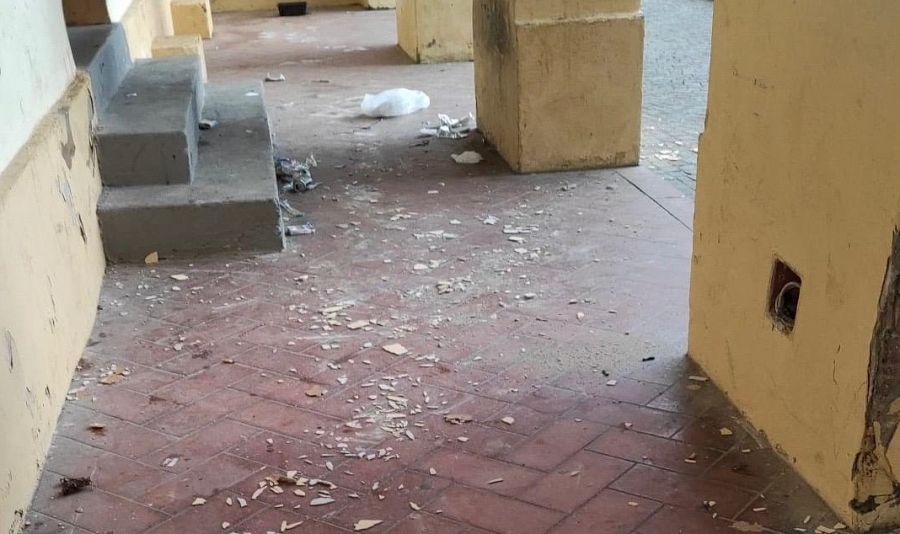 Le arcate dell'edificio sono state deturpate con scritte e graffiti, e parte dell'intonaco è stato danneggiato con i detriti finiti a terra.