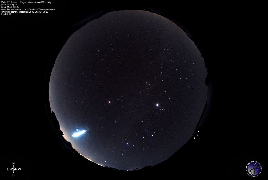 A renderlo noto, con un post su Facebook è l'astrofisico Gianluca Masi, responsabile scientifico del Virtual Telescope: "La camera allsky del Virtual Telescope Project situata a Manciano lo ha catturato, - scrive Masi- dimostrando la sua grande utilità nel monitoraggio della notte, dal tramonto all’alba. Si nota come la sua estrema luminosità abbia saturato il sensore, nonostante fosse in movimento (dunque la sua luce non ha insistito sugli stessi pixel a lungo) e di breve durata. Una prima stima grossolana della sua luminosità si attesta tra le mag. -10 e -8 (La Luna piena è di mag. -12.6).Bellissimo, poi, il campo stellare, dominato dalla costellazione di Orione, Auriga, dalla brillante Sirio e dai pianeti Giove e Marte".