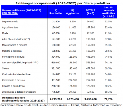 Il sistema produttivo aprirà a oltre 265mila lavoratori per sostituire chi lascia il posto per limiti di età e per coprire nuove posizioni