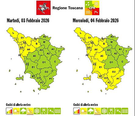 In particolare l’allerta di codice giallo per rischio idraulico del reticolo maggiore interesserà non solo le Valli del Bisenzio e dell’Ombrone pistoiese, ma anche il Valdarno inferiore, la Valdelsa e la Valdera, la Maremma e la costa e l’entroterra livornese, le valli del Fiora, dell’Albegna e la costa grossetana, oltre alla valle dell’Ombrone grossetano.