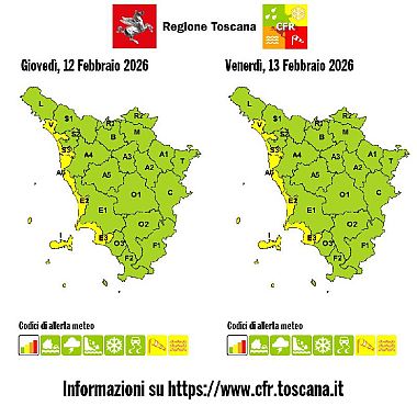 TOSCANA — Proseguirà fino a mezzogiorno di domani, venerdì 13 Febbraio, l'allerta meteo per mareggiate e vento forte su costa e arcipelago.